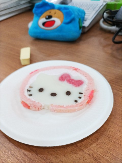 先日、差し入れでいただいたキティちゃんのかまぼこです(ほんとはロールケーキ)